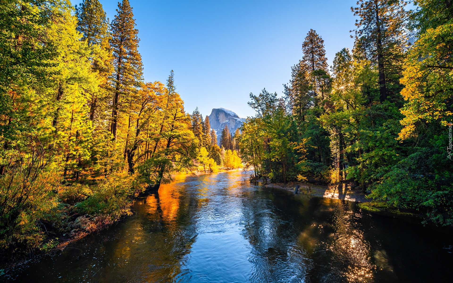 Edytor tapety: Rozświetlone jesienne drzewa nad rzeką Merced River