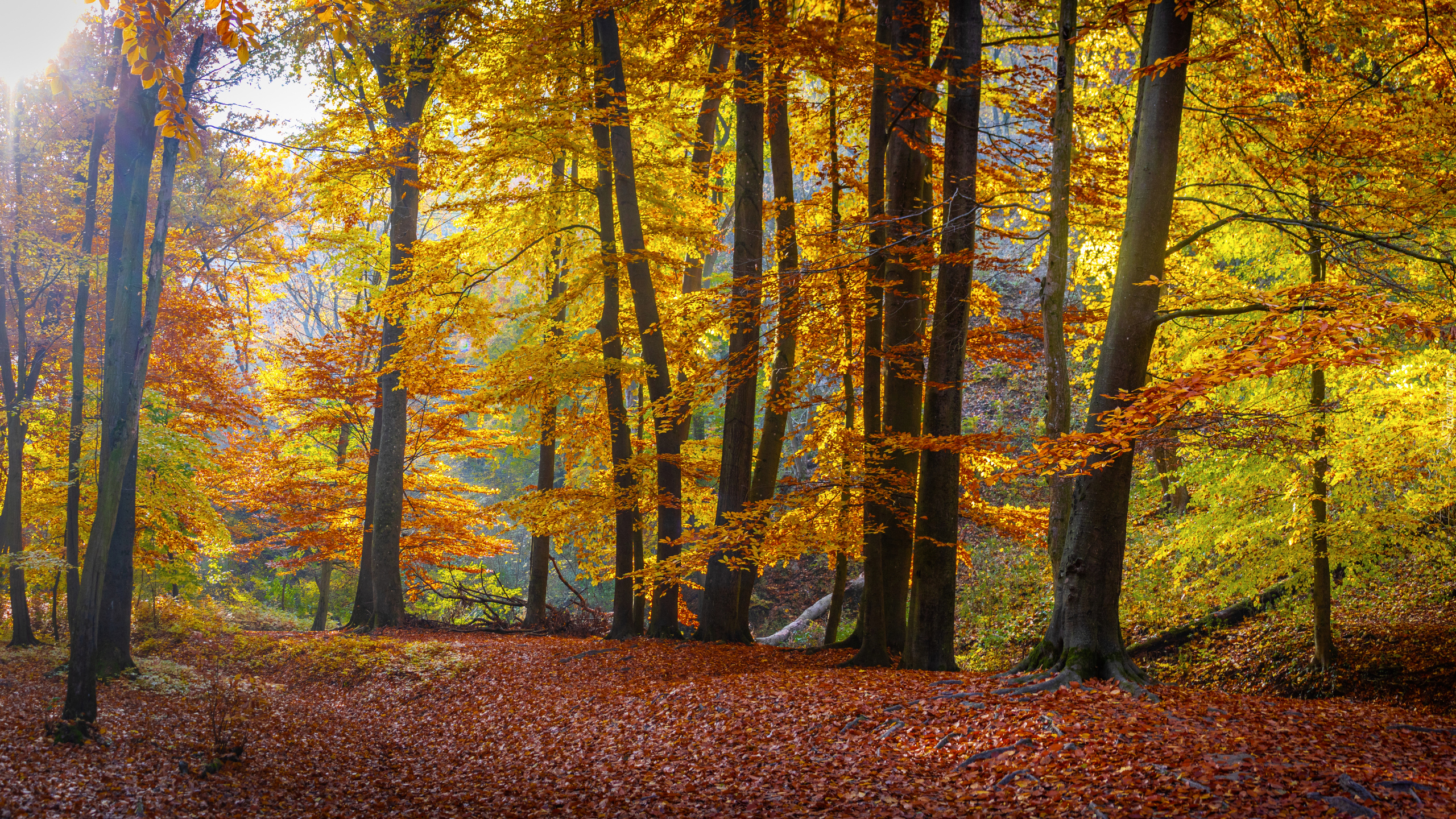 Edytor tapety: Opadłe liście na drodze w słonecznym lesie