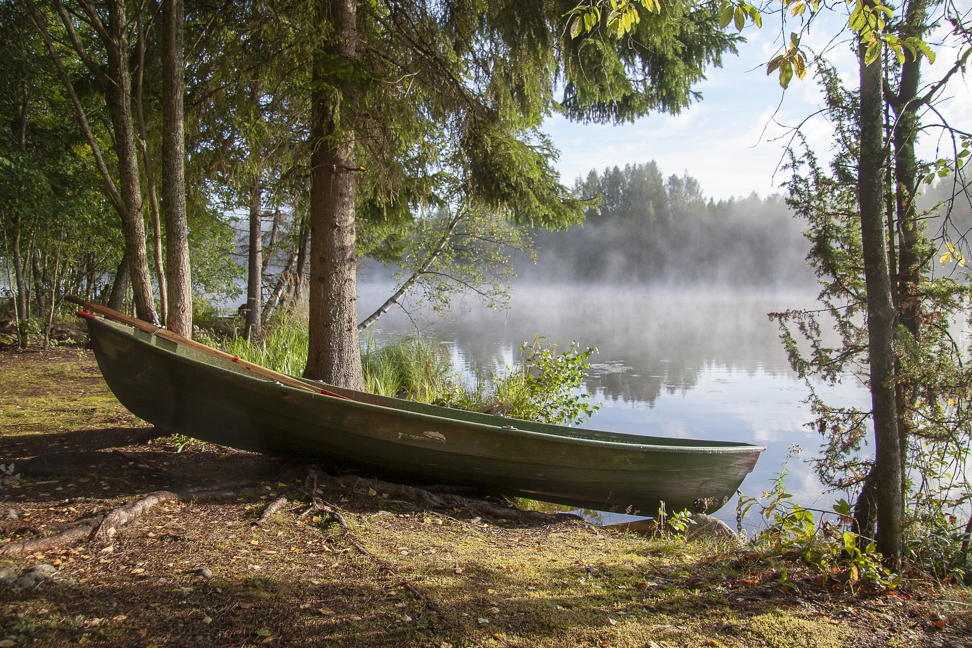 Edytor tapety: Łódka pod drzewami na brzegu zamglonego jeziora