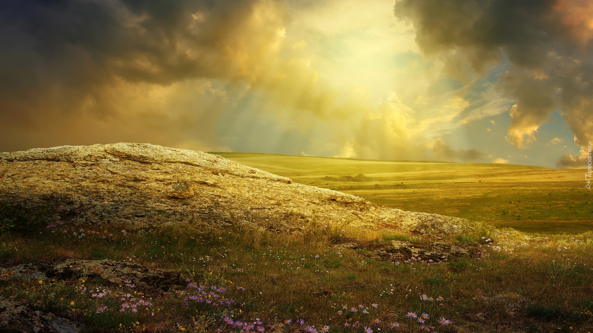 Edytor tapety: Promienie słońca nad łąkami