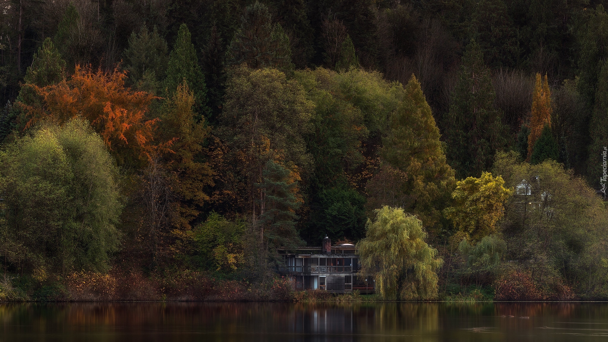 Edytor tapety: Dom na skraju lasu nad jeziorem
