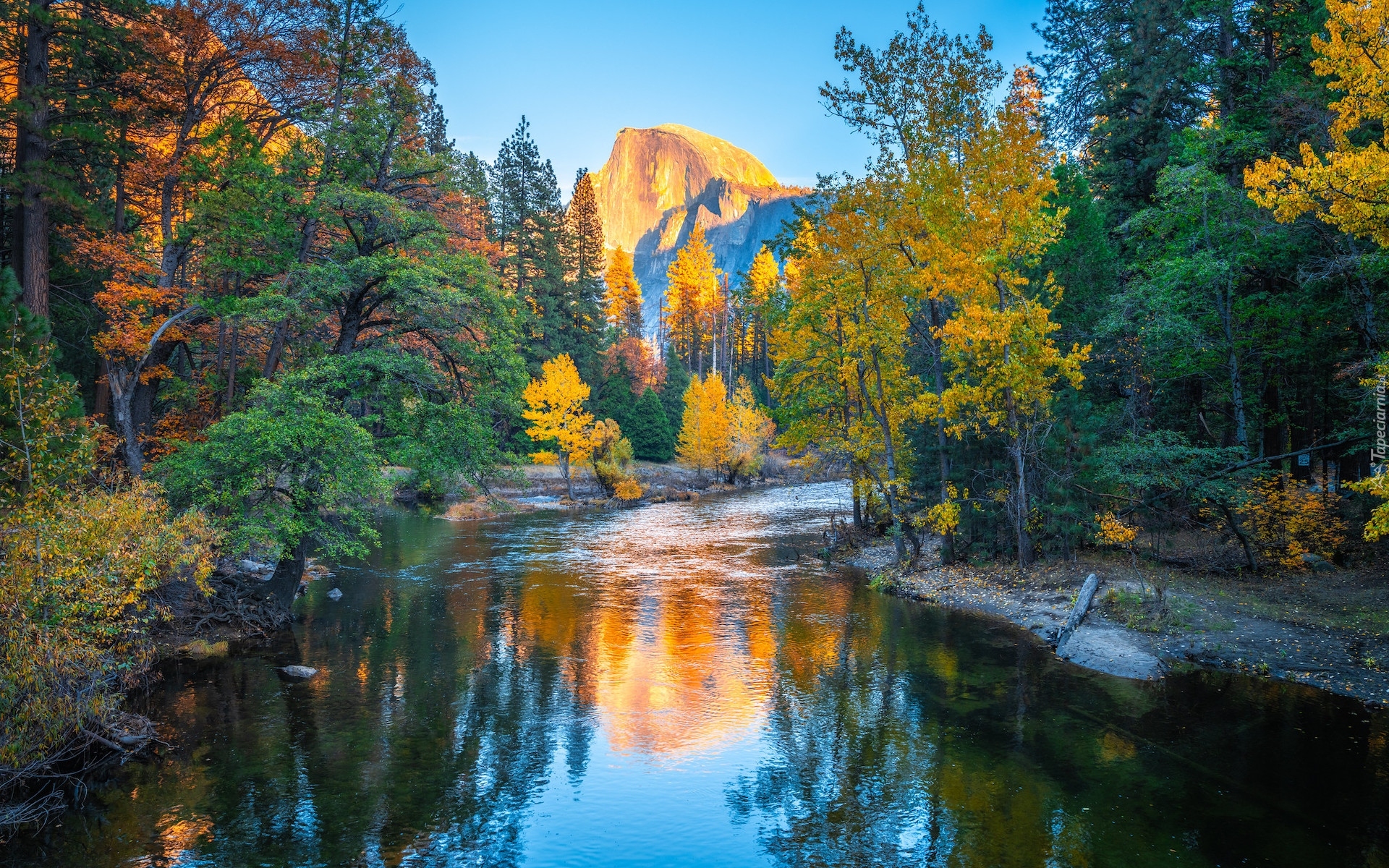 Edytor tapety: Rozświetlona góra Half Dome i rzeka Merced River