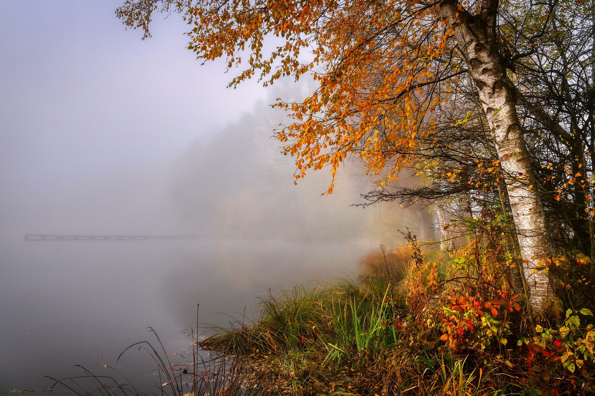 Edytor tapety: Rośliny i drzewa nad zamglonym jeziorem