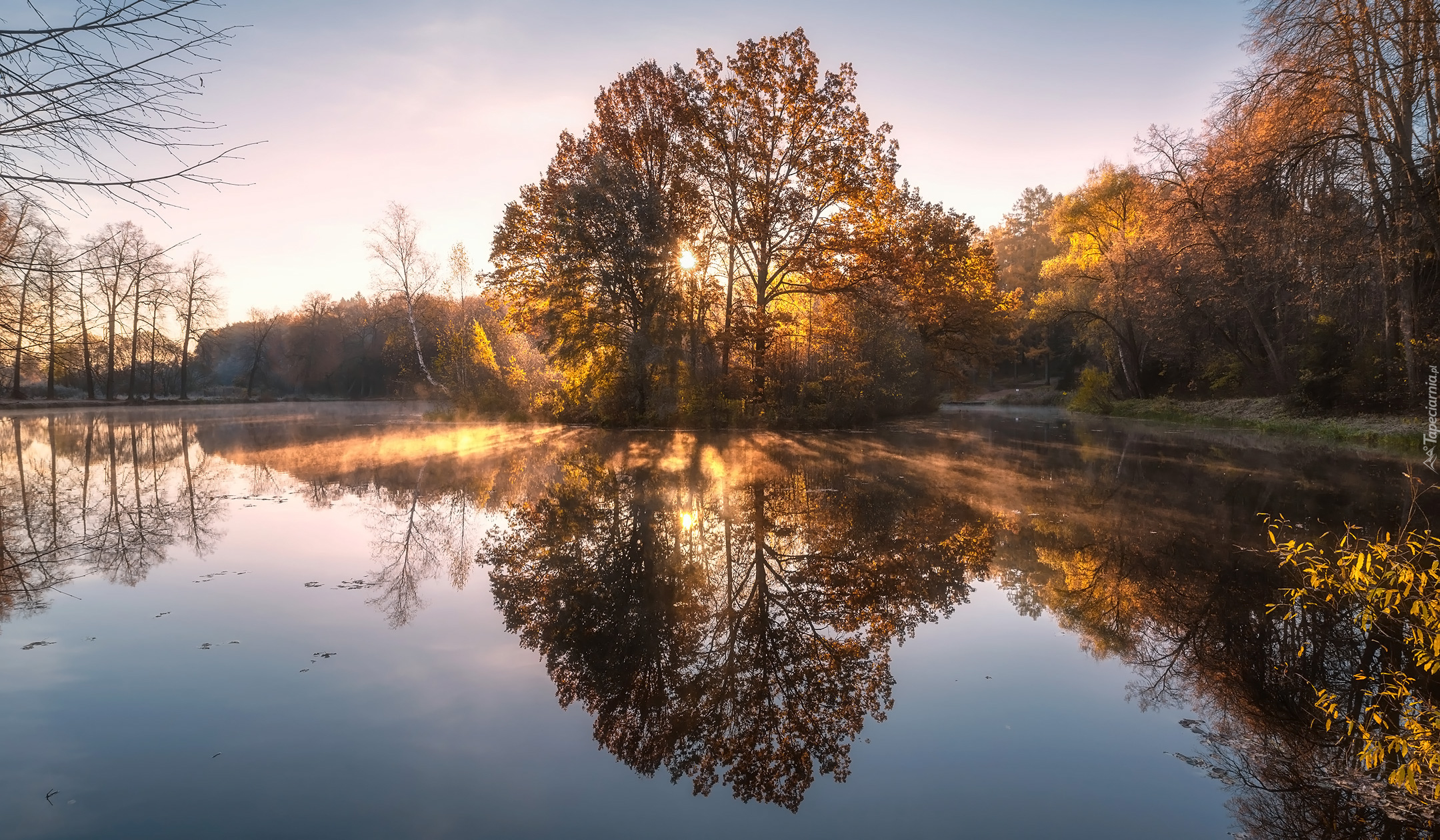 Edytor tapety: Odbicie pożółkłych drzew w jeziorze