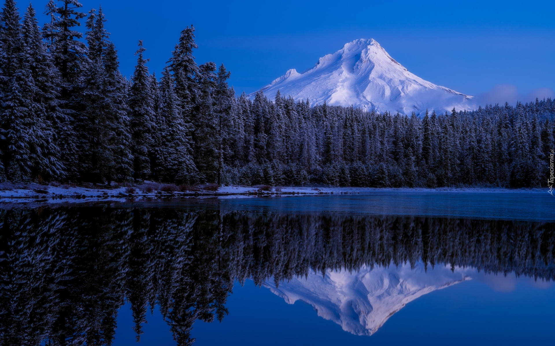 Edytor tapety: Odbicie ośnieżonego stratowulkanu Mount Hood w jeziorze