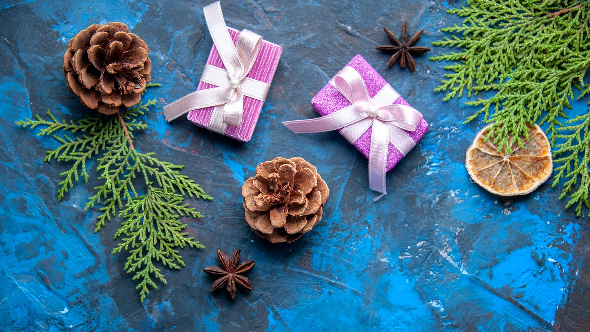 Edytor tapety: Prezenty i szyszki na niebieskim tle