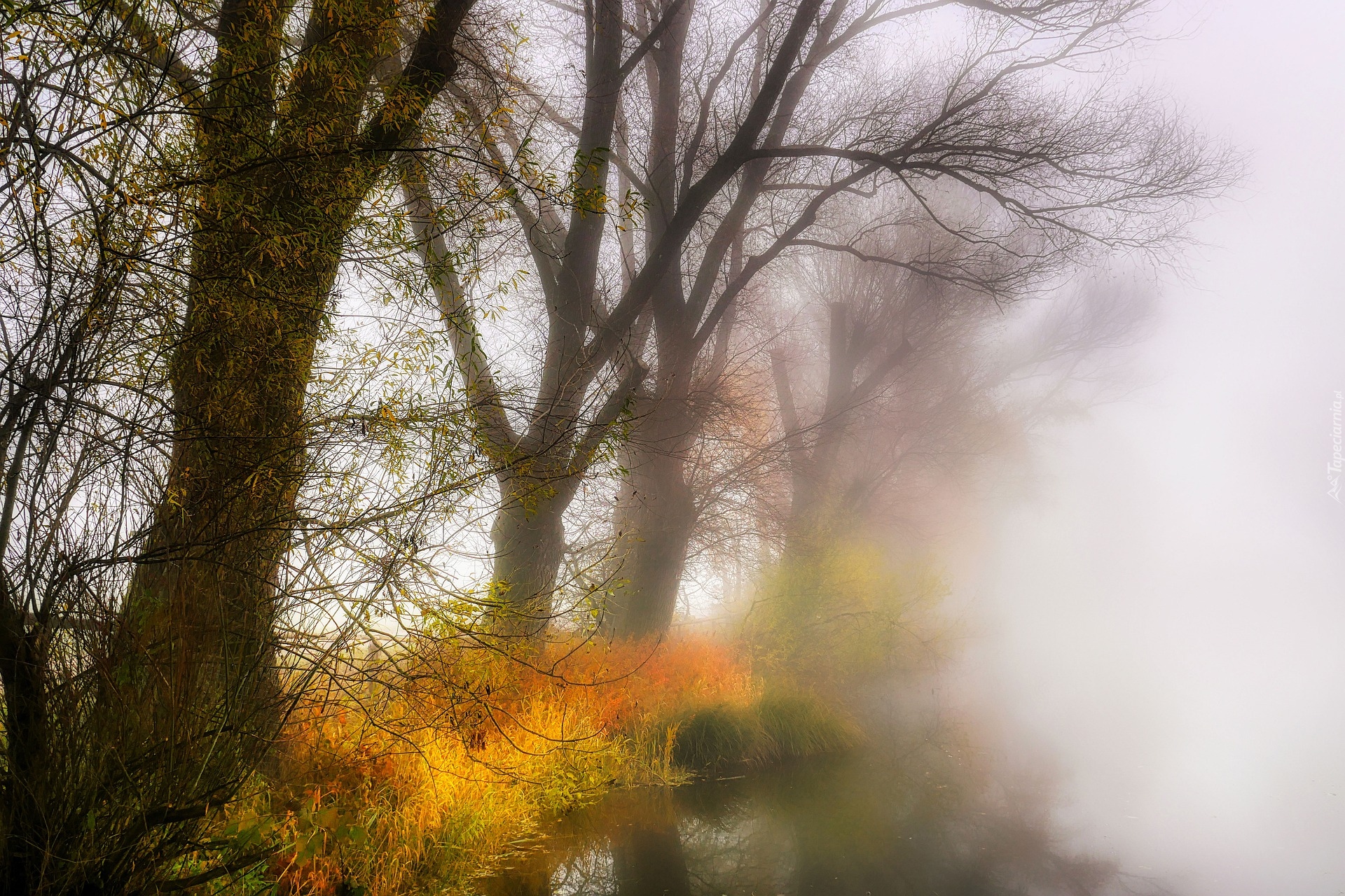 Edytor tapety: Drzewa i pożółkłe trawy nad zamglonym jeziorem
