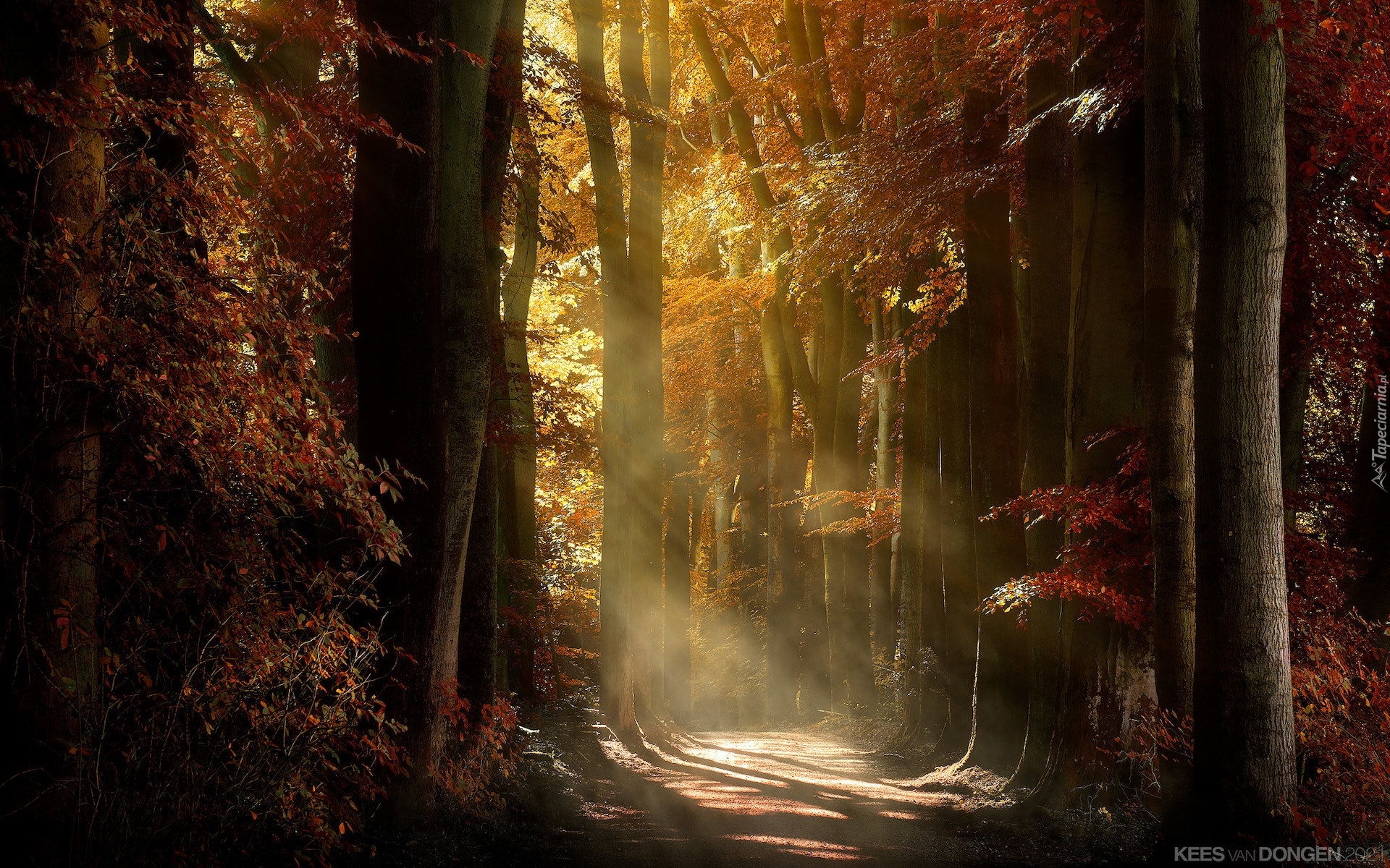 Edytor tapety: Słoneczne światło padające na drogę w jesiennym lesie