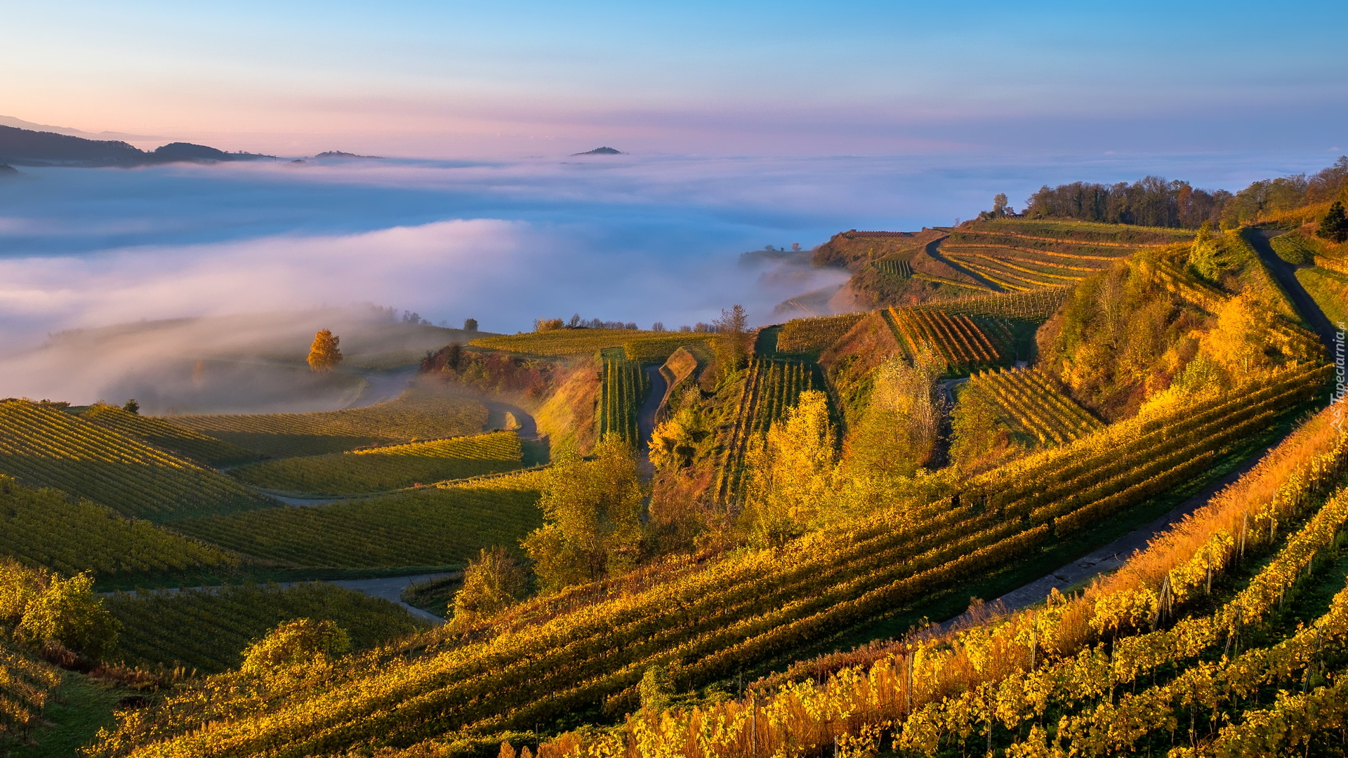 Edytor tapety: Mgła nad winnicami na wzgórzach Kaiserstuhl