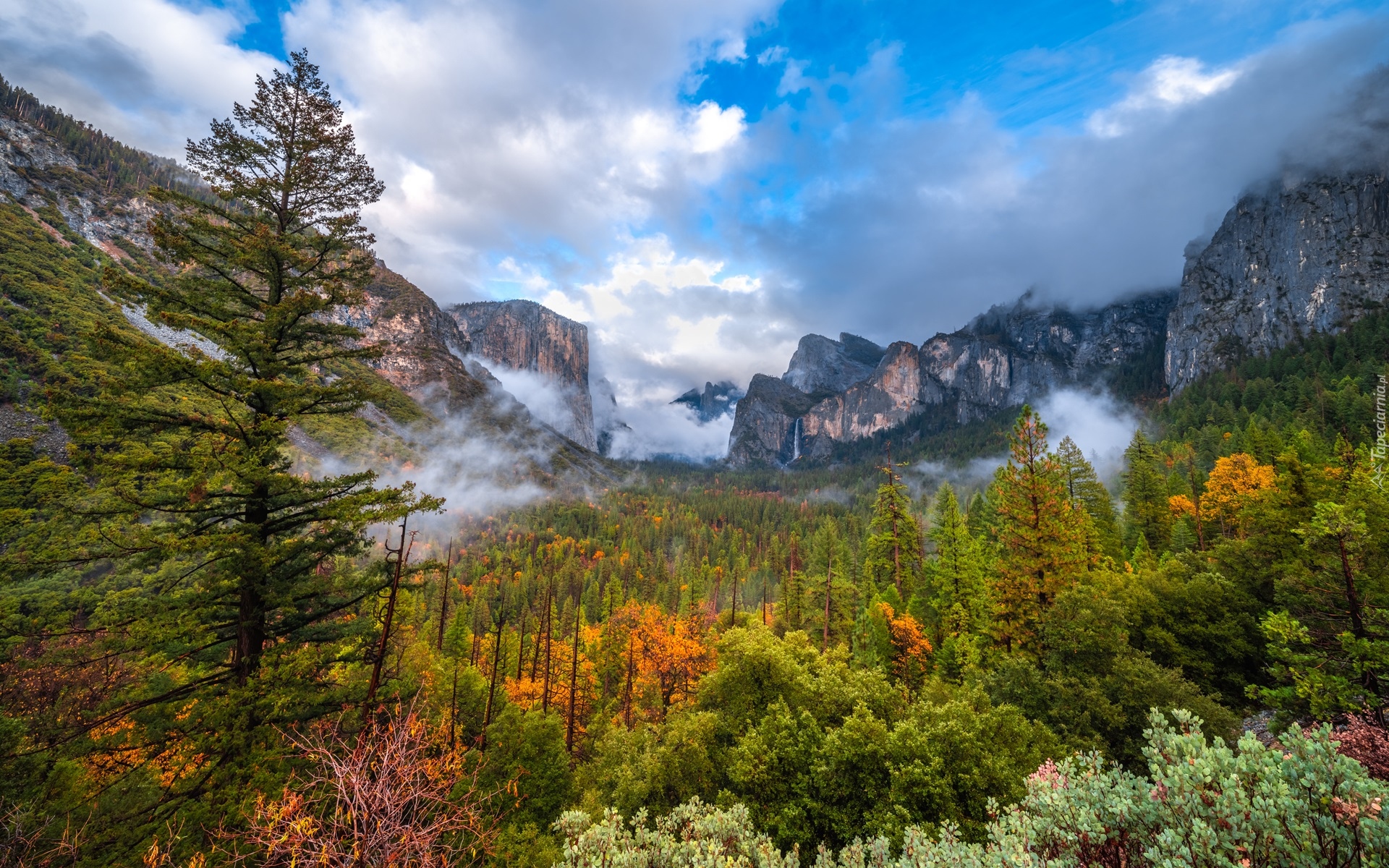 Edytor tapety: Jesienne drzewa i mgła w dolinie Yosemite Valley