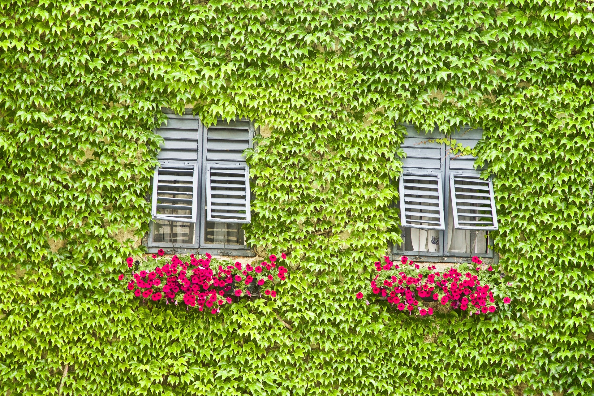 Edytor tapety: Dwa okna z petuniami na porośniętej liśćmi ścianie