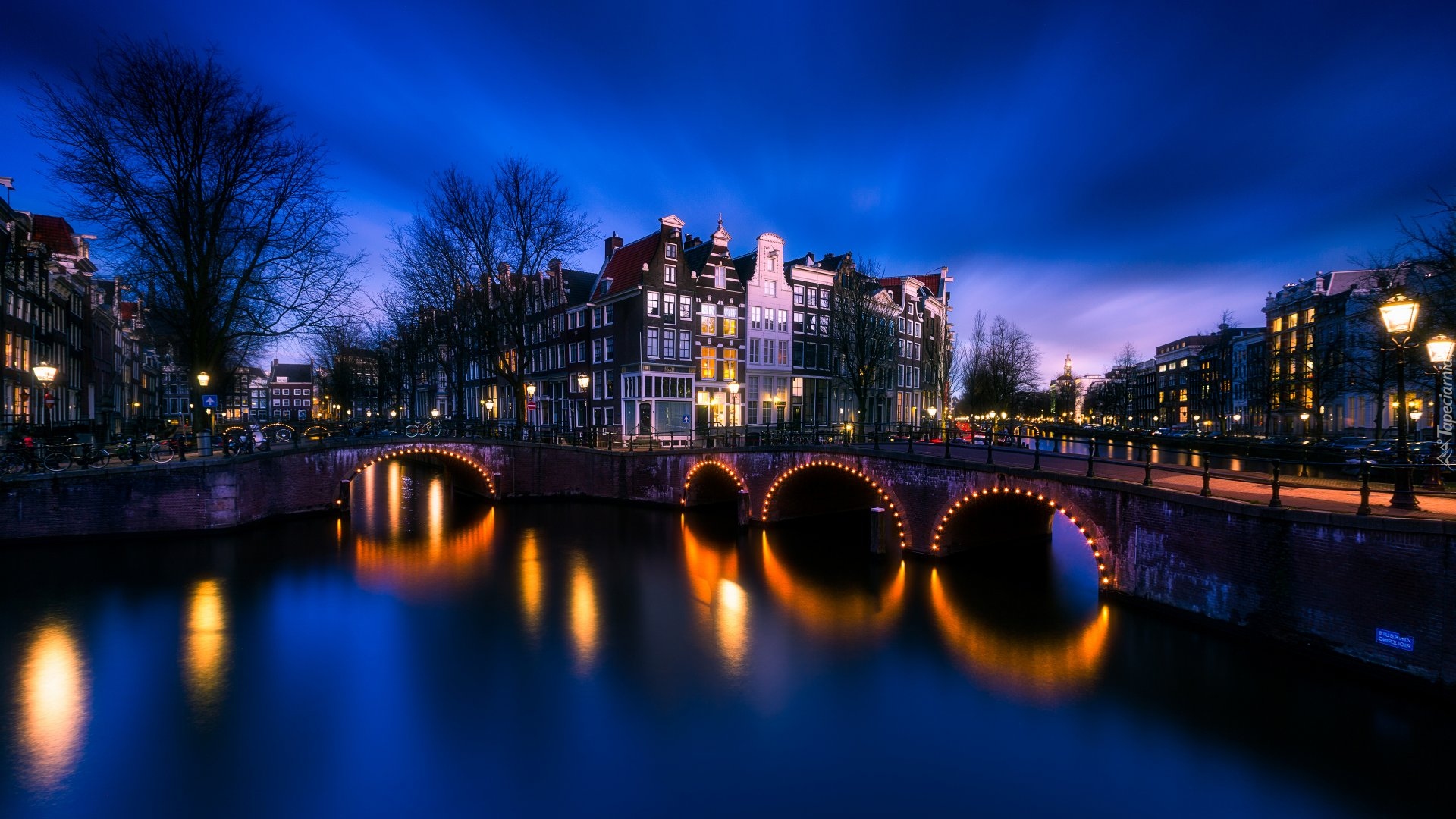 Edytor tapety: Oświetlony most i budynki nad rzeką w Amsterdamie