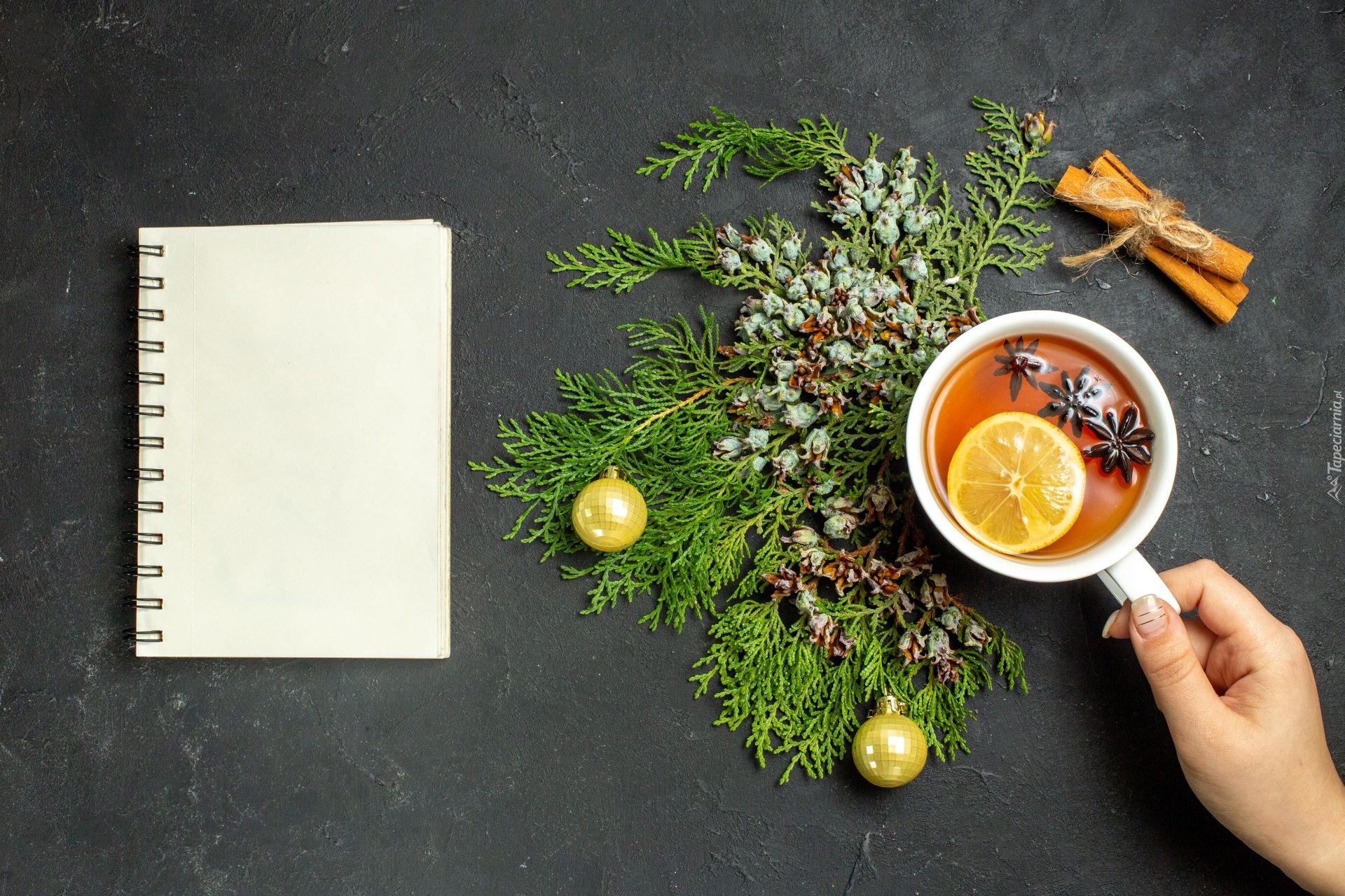 Edytor tapety: Filiżanka herbaty obok gałązek i notatnika