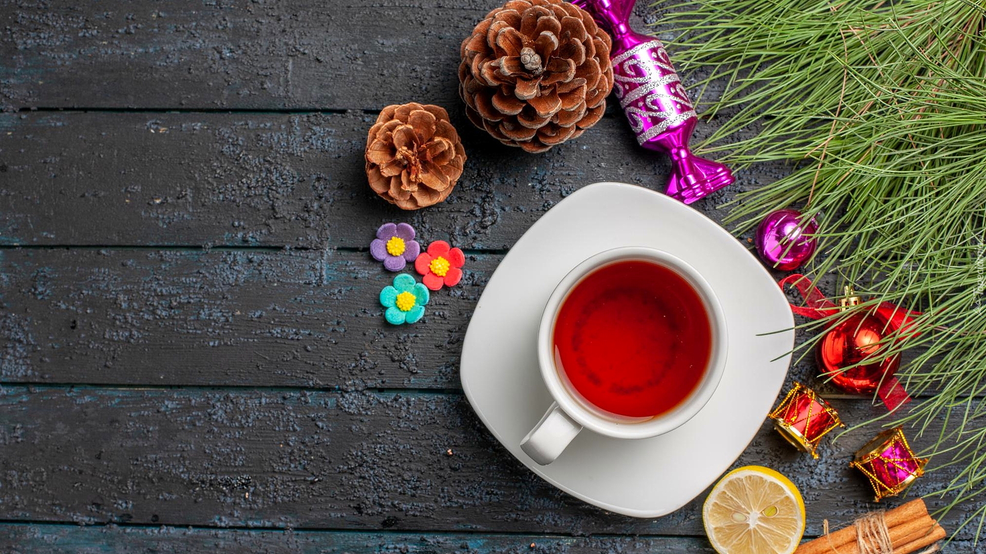 Edytor tapety: Filiżanka herbaty obok trawy i bombek na deskach