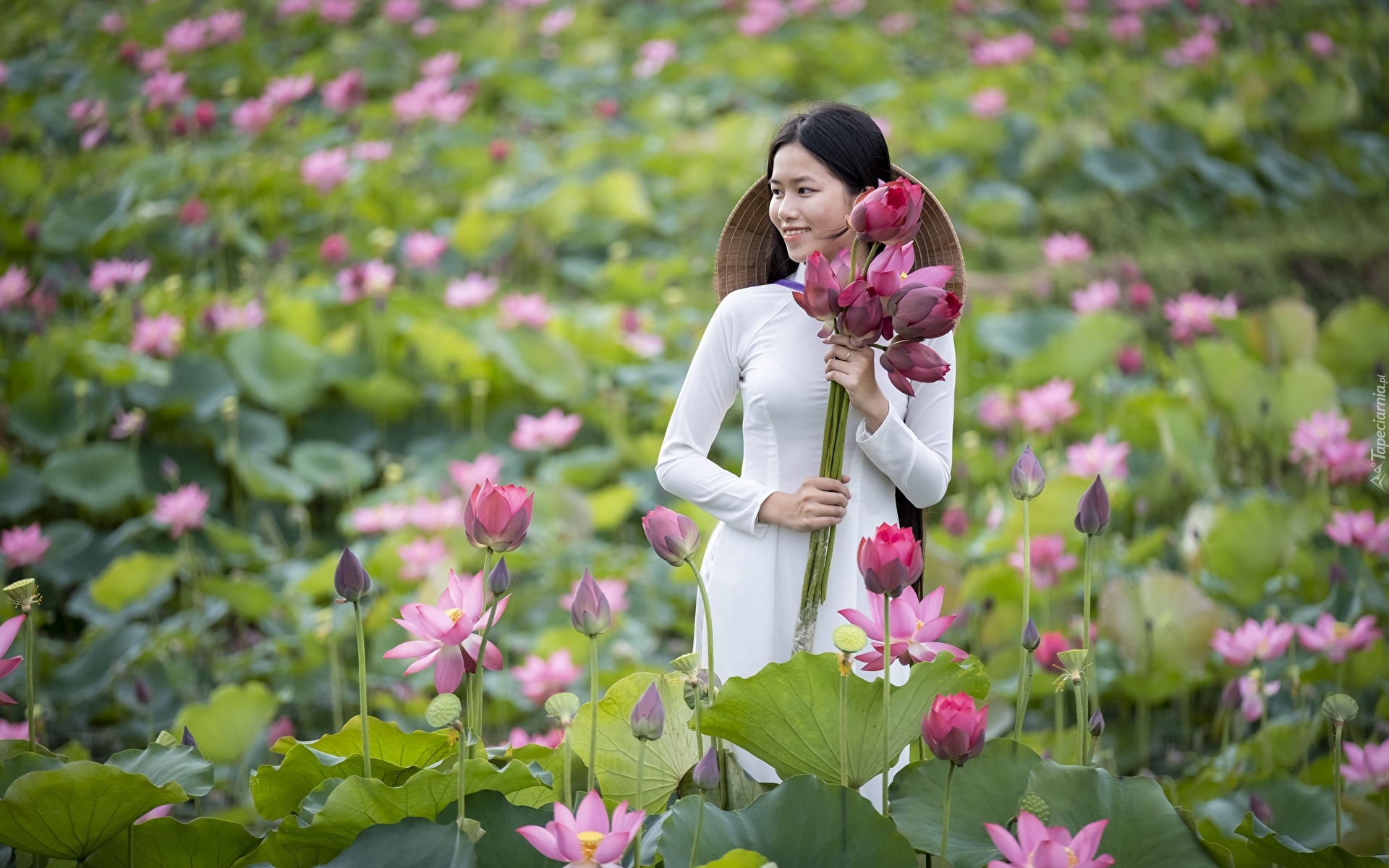 Edytor tapety: Azjatka z kwiatami lotosu