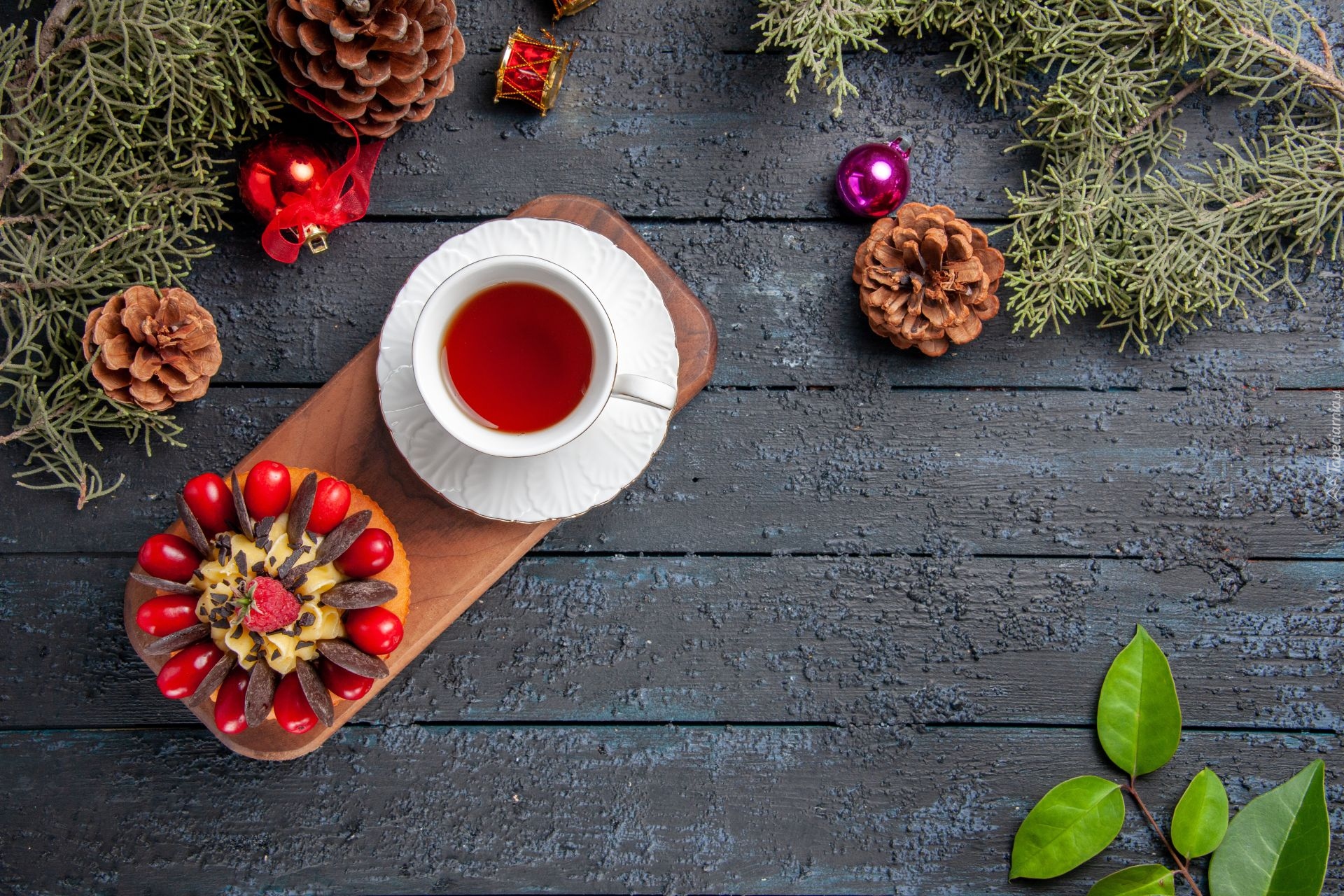 Edytor tapety: Filiżanka herbaty i ciasto na drewnianej tacy