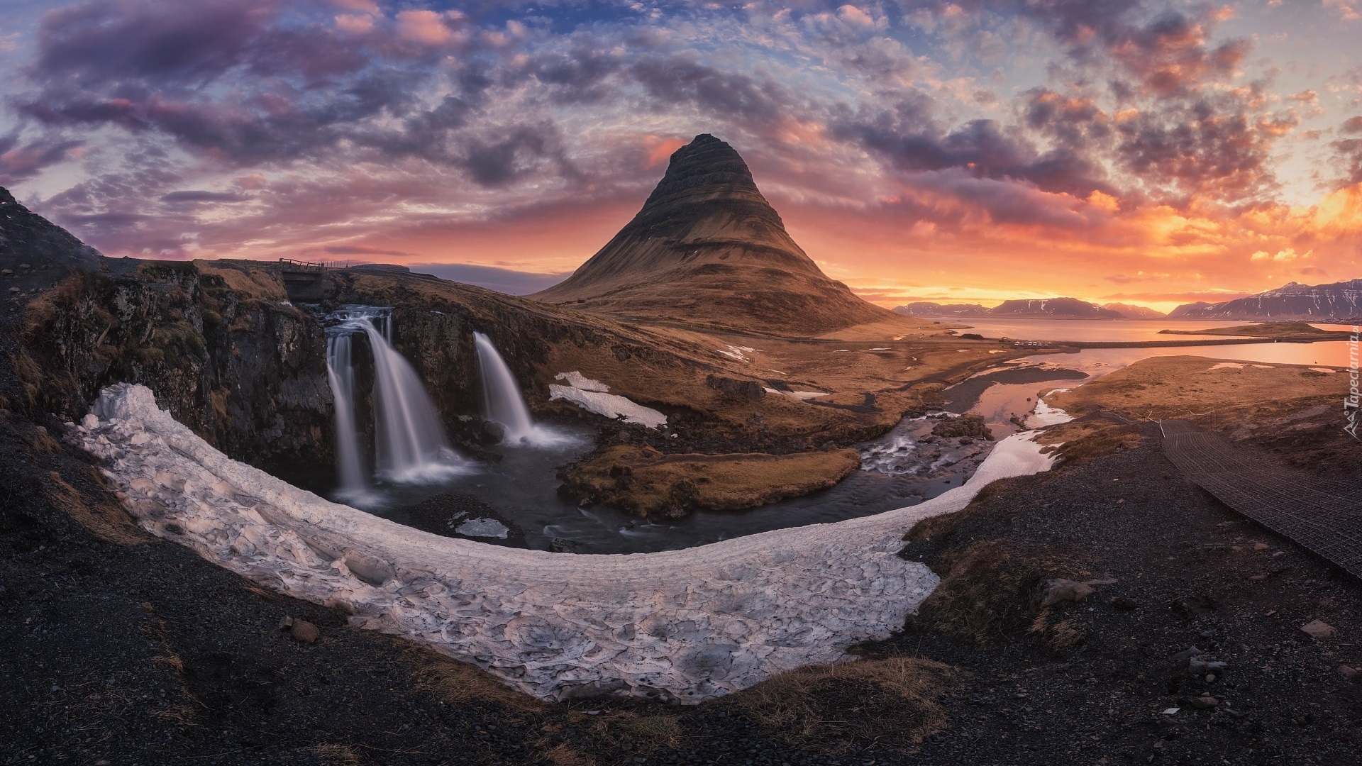 Edytor tapety: Góra Kirkjufell i wodospad Kirkjufellsfoss o zachodzie słońca