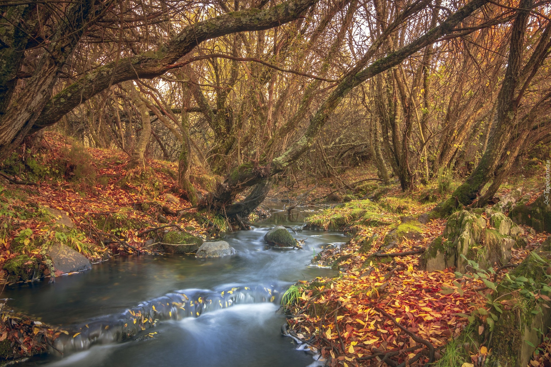 Edytor tapety: Pochyłe bezlistne drzewa nad leśną rzeczką