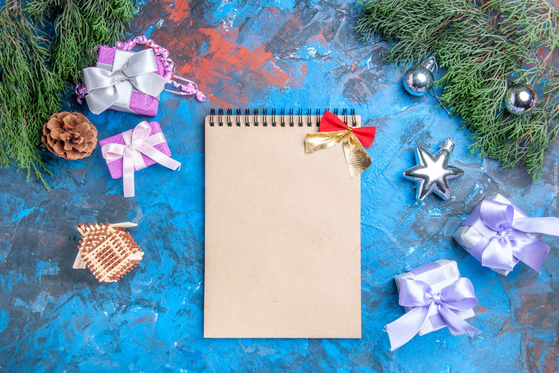 Edytor tapety: Świąteczne ozdoby obok notatnika na niebieskim tle