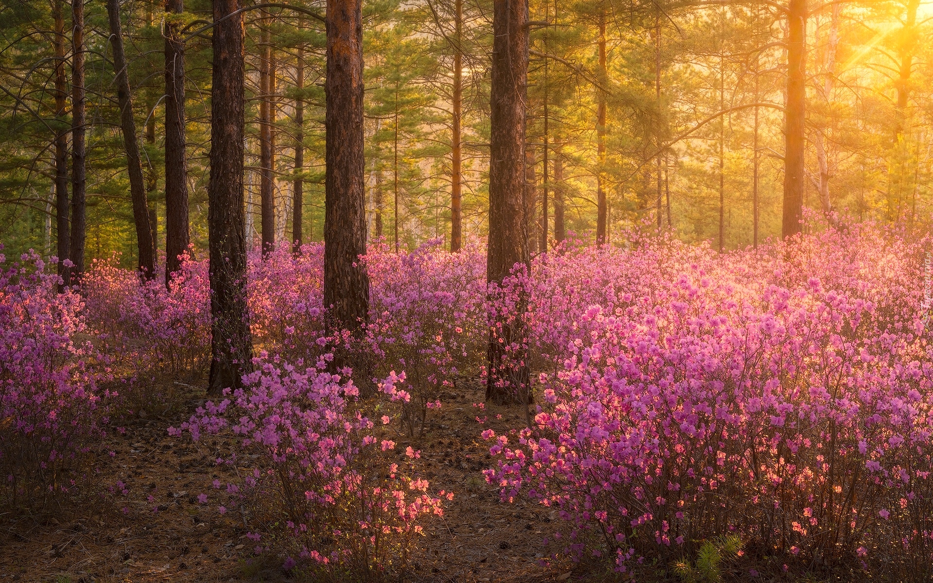 Edytor tapety: Różowe kwiaty pod drzewami w lesie