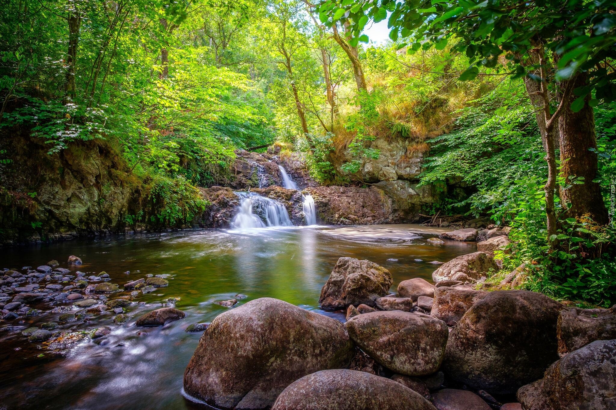 Edytor tapety: Leśny potok na skałach spadający do rzeki