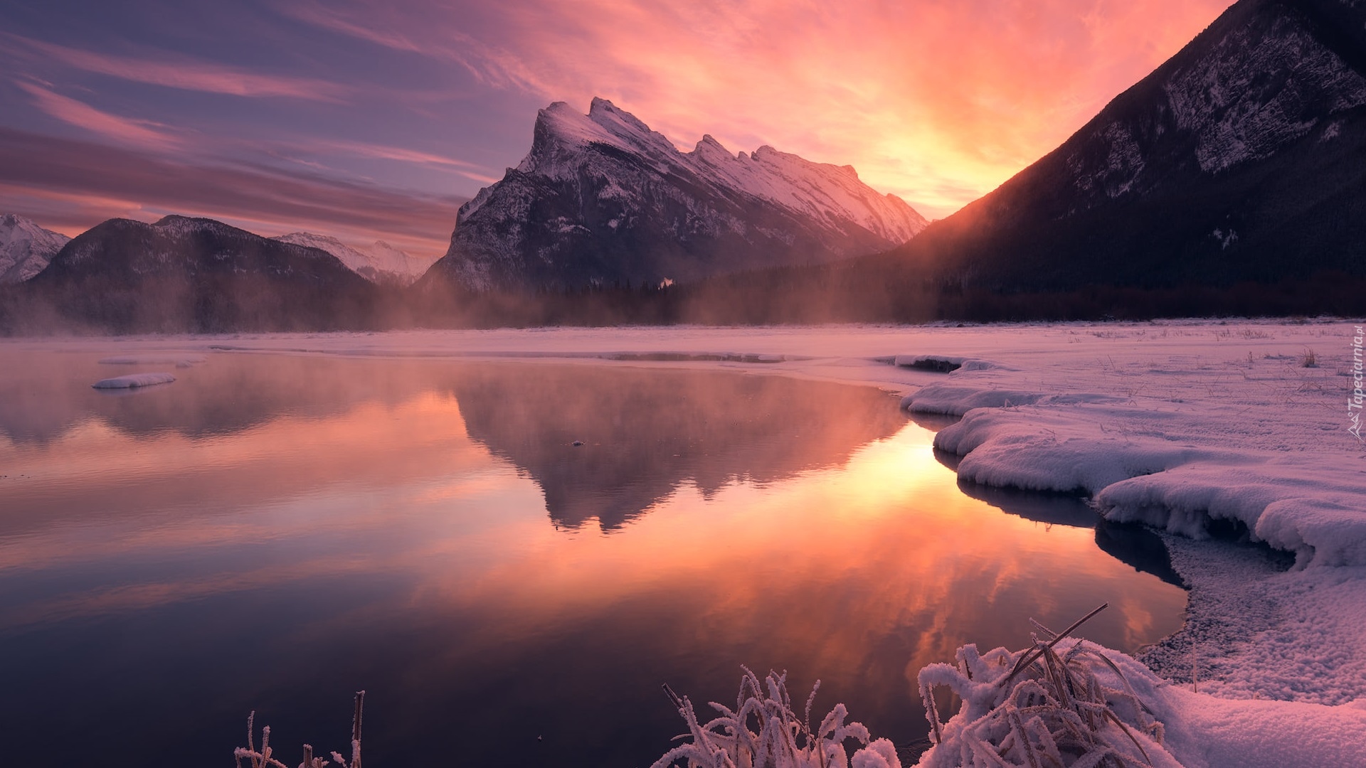 Edytor tapety: Góry w blasku wschodzącego słońca zimową porą
