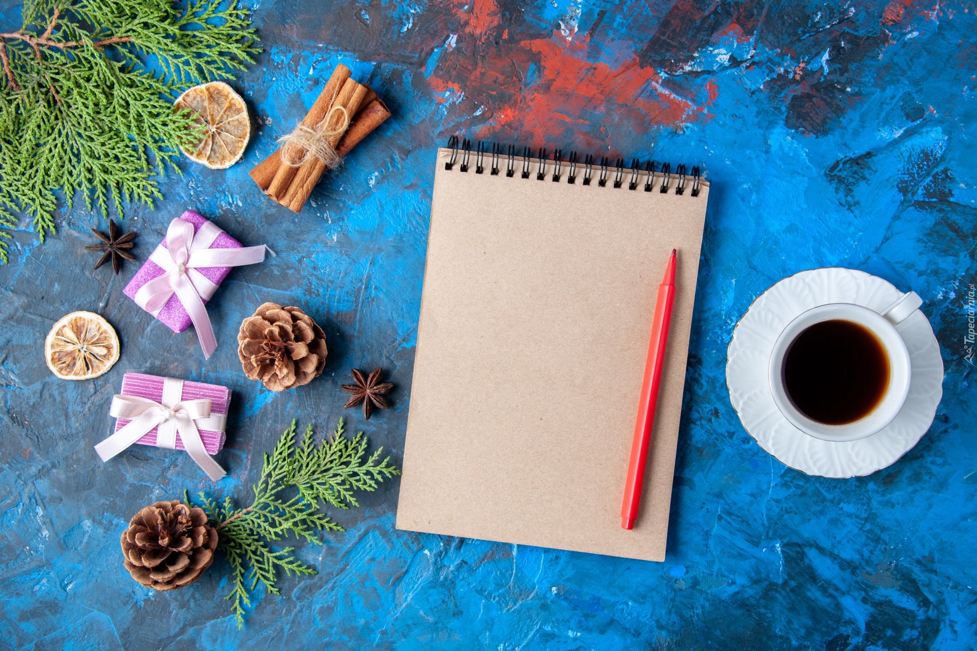 Edytor tapety: Notatnik i filiżanka obok szyszek i prezentów