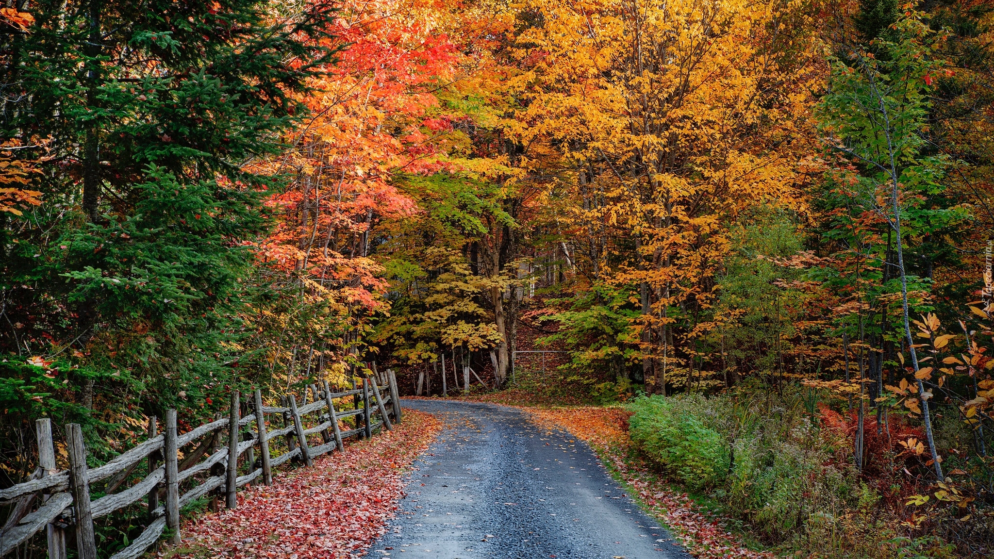 Edytor tapety: Ogrodzenie przy drodze w jesiennym lesie