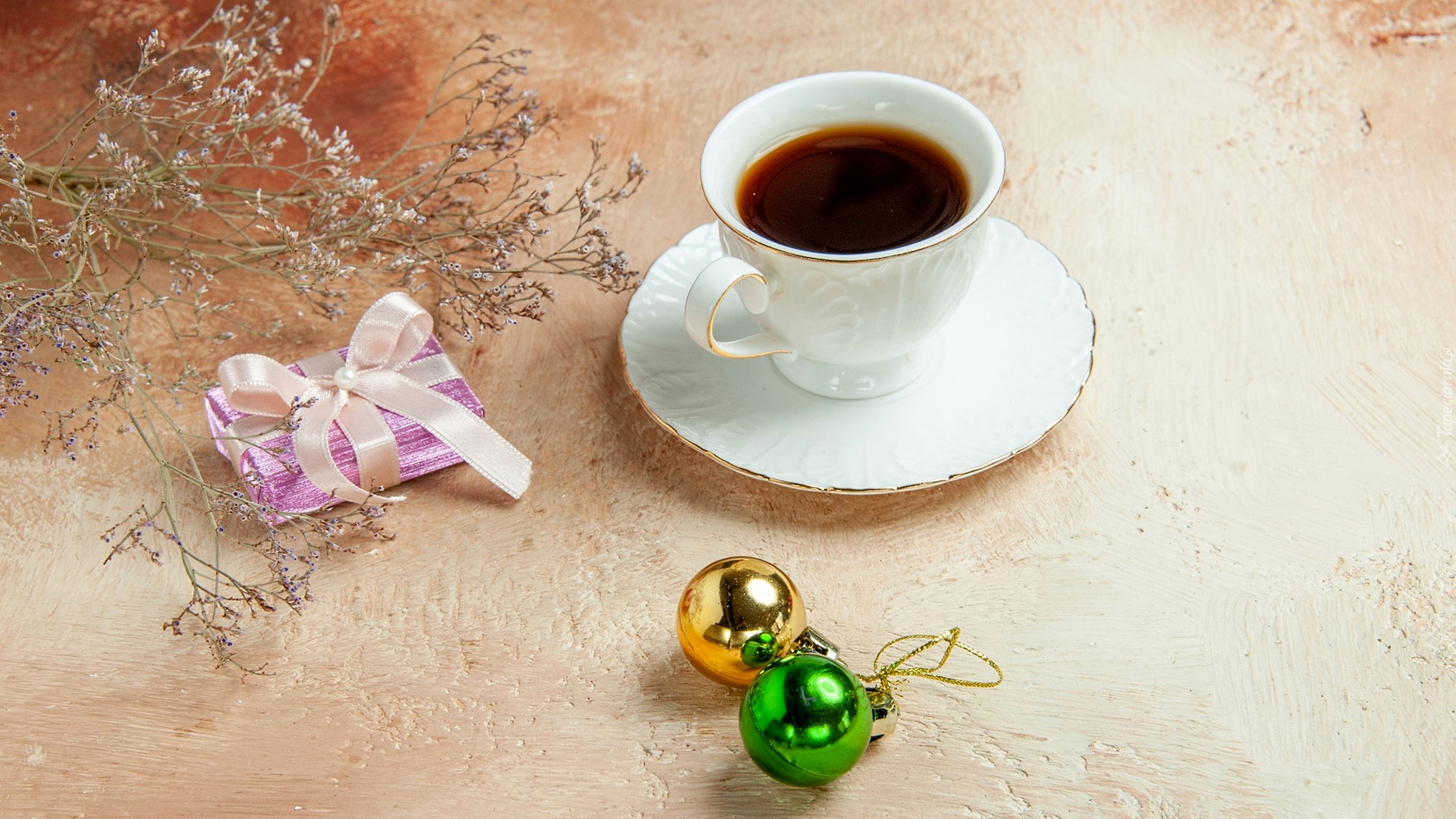 Edytor tapety: Bombki i prezent przy filiżance kawy