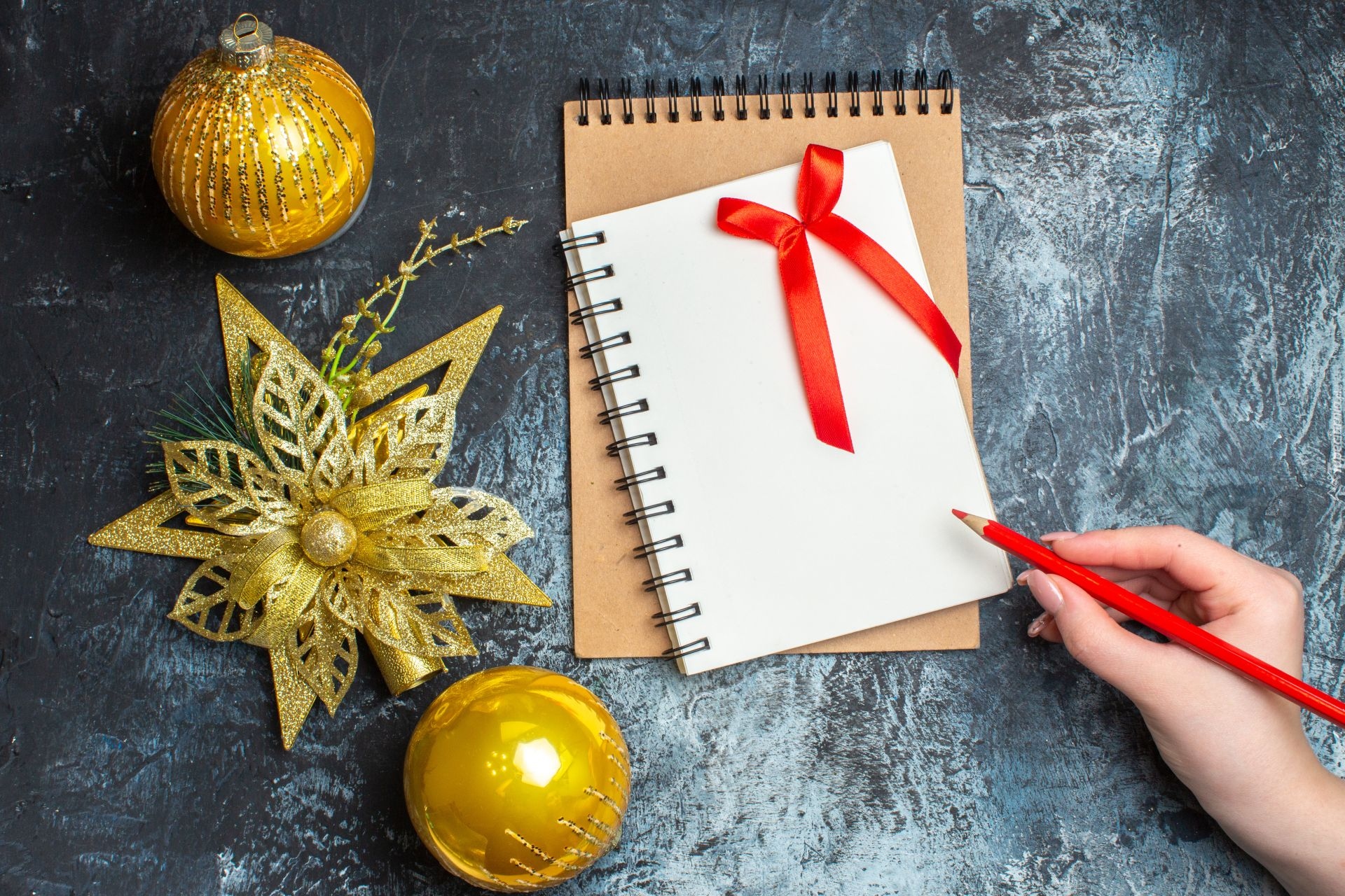 Edytor tapety: Notatnik ze wstążką obok bombek i gwiazdy