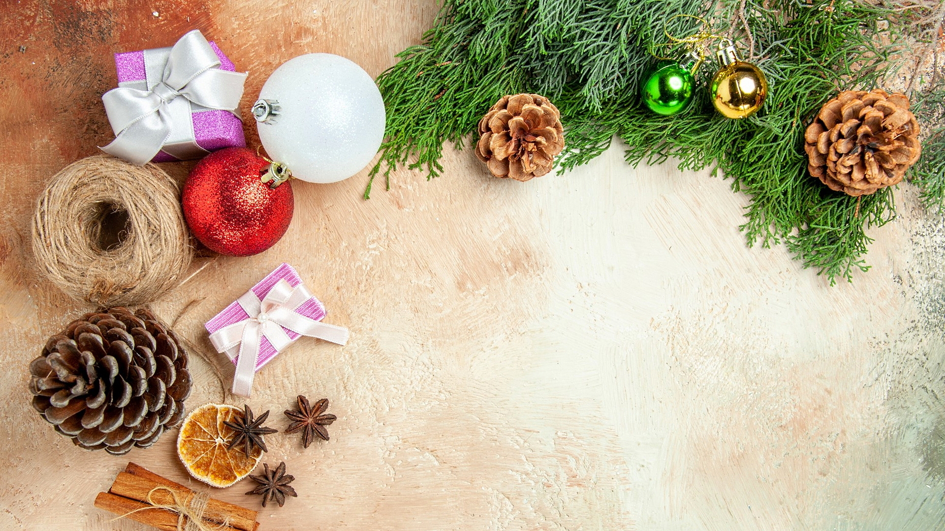 Edytor tapety: Bombki obok szyszek i prezentów w dekoracji świątecznej