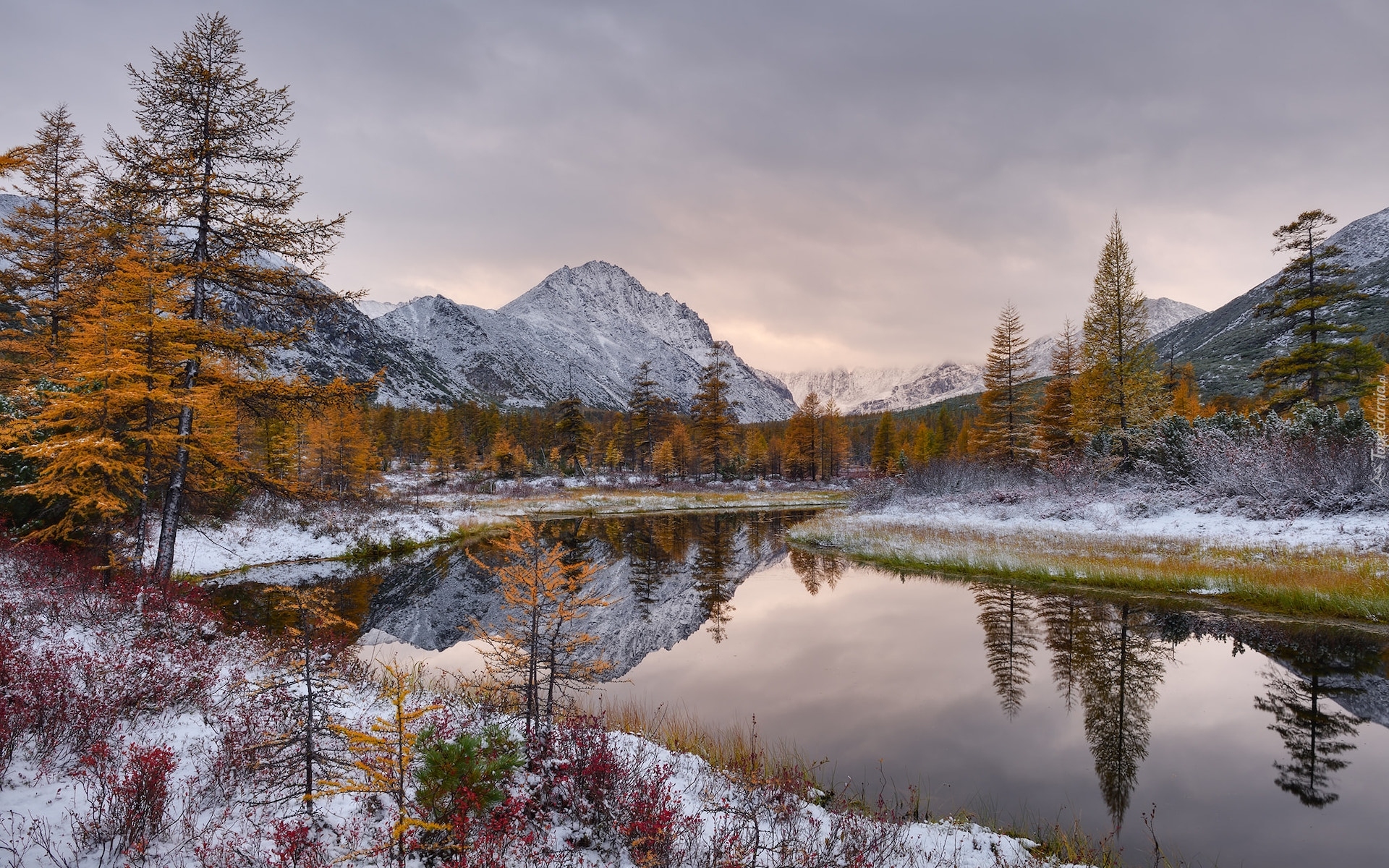 Edytor tapety: Pożółkłe drzewa nad rzeką w Górach Kołymskich