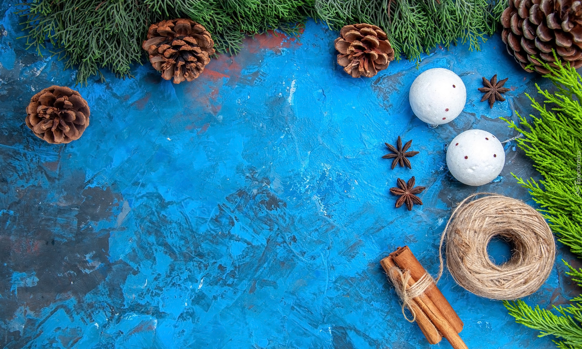Edytor tapety: Szyszki i gałązki na niebieskim tle