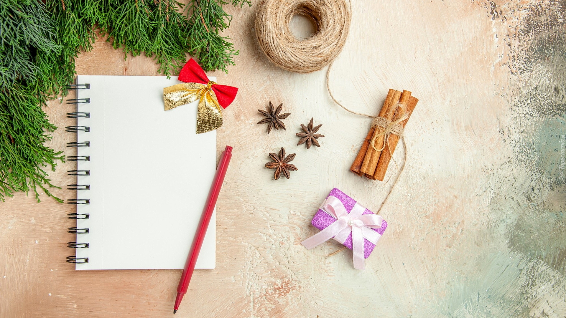 Edytor tapety: Notatnik z kokardką i mazakiem pod gałązkami
