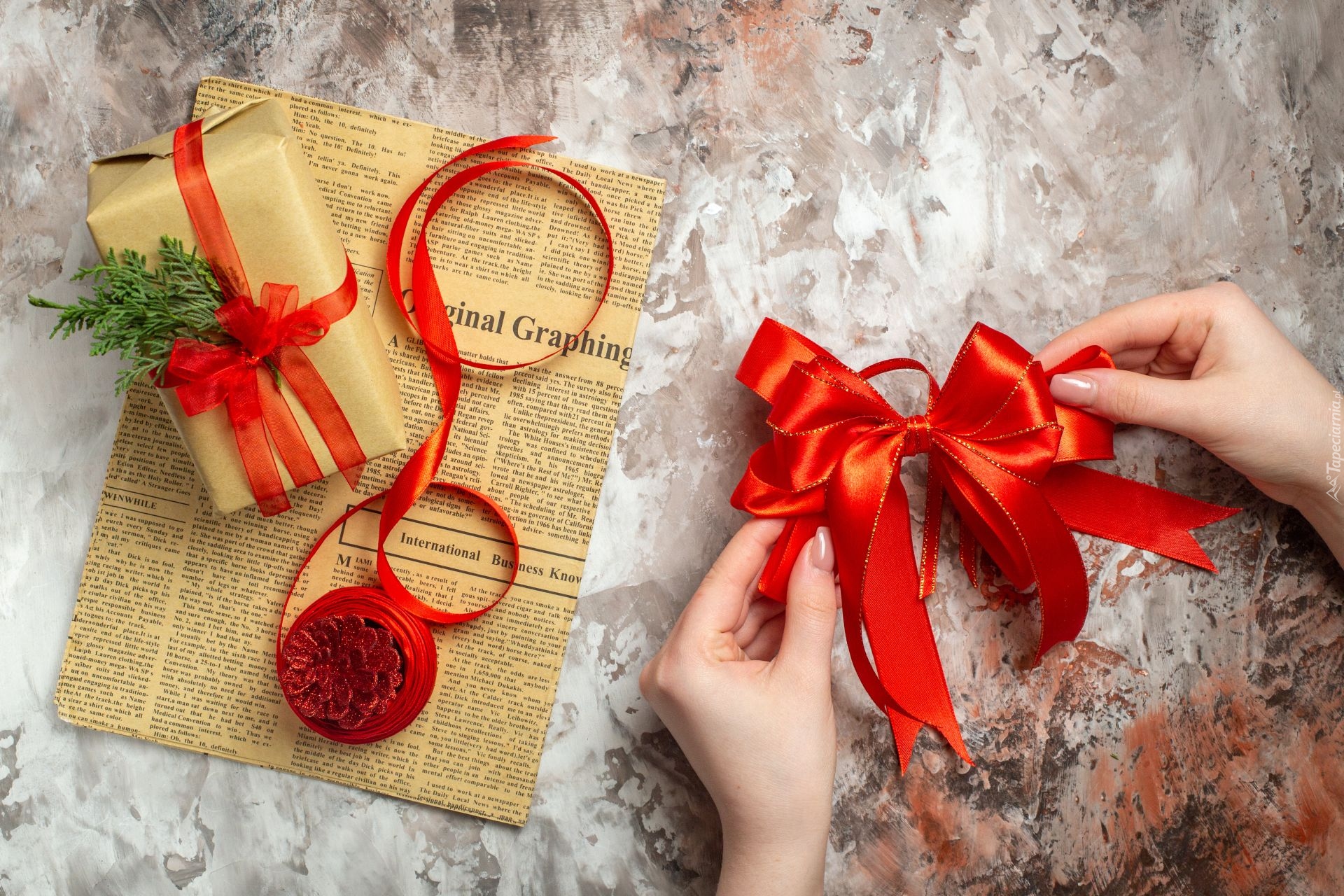Edytor tapety: Kokardka w dłoni obok prezentu na gazecie