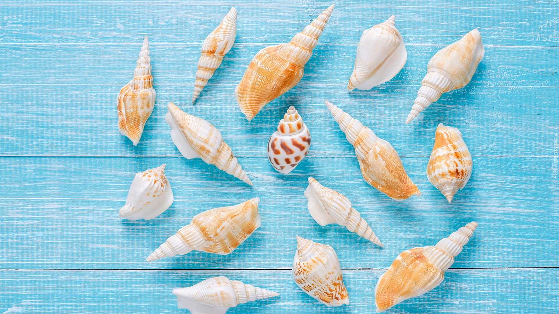 Edytor tapety: Muszelki na niebieskich deskach