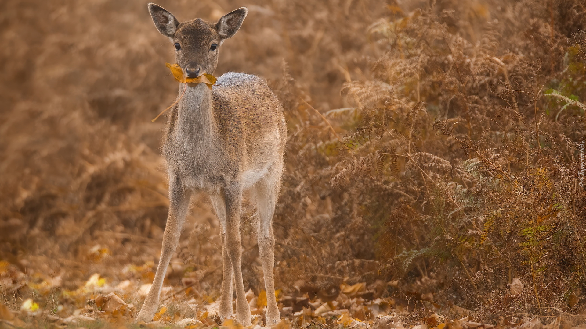 Edytor tapety: Sarna z liściem w pyszczku