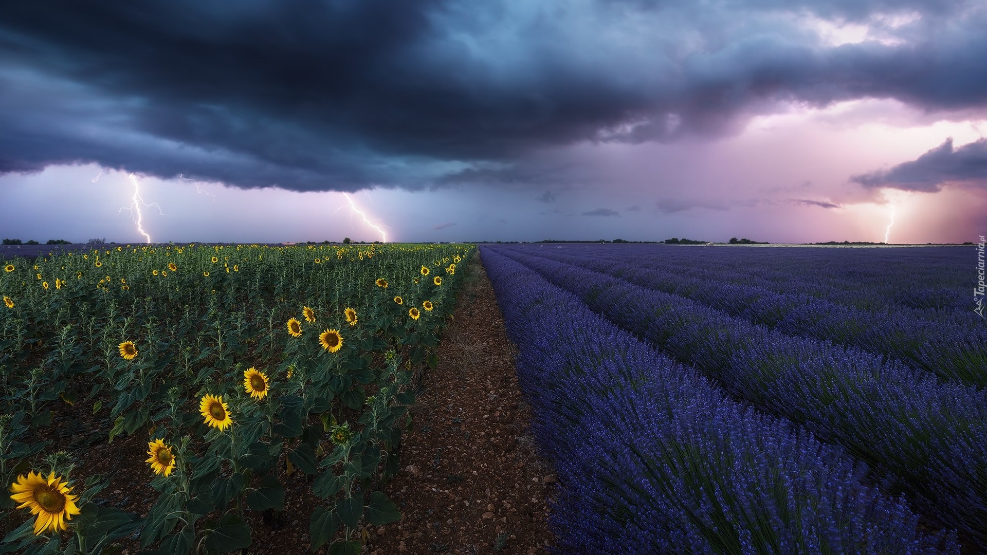 Edytor tapety: Pioruny nad polem słoneczników i lawendy