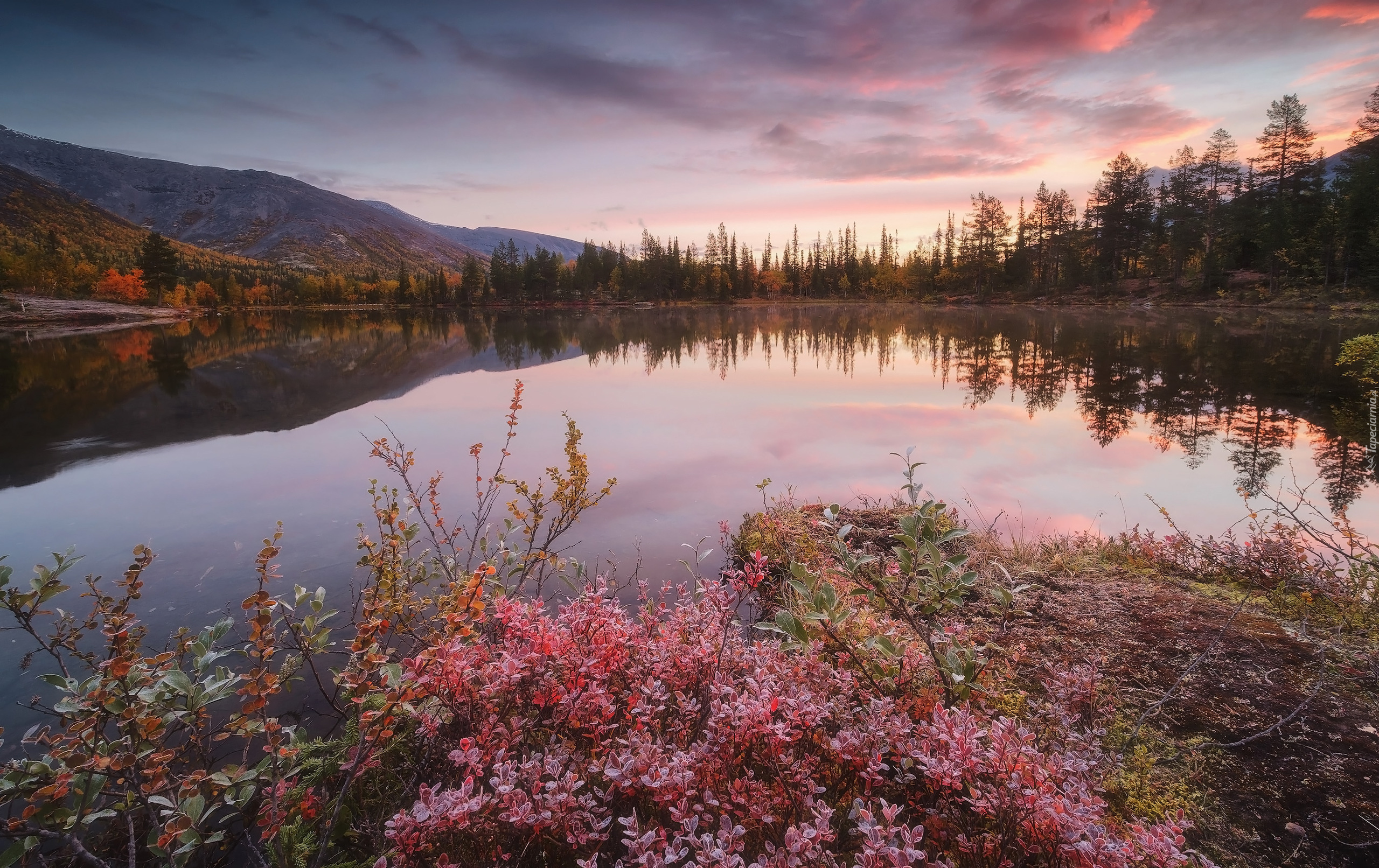 Edytor tapety: Kolorowe rośliny nad jeziorem na Półwyspie Kolskim