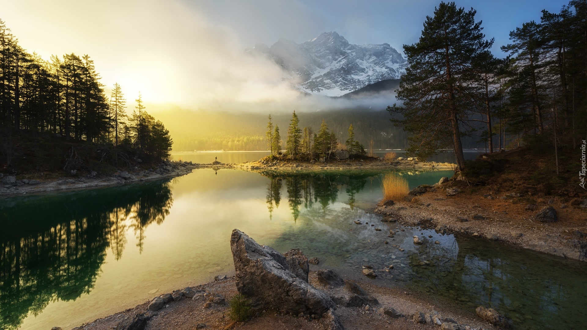 Edytor tapety: Jezioro Eibsee z widokiem na zamglony szczyt Zugspitze