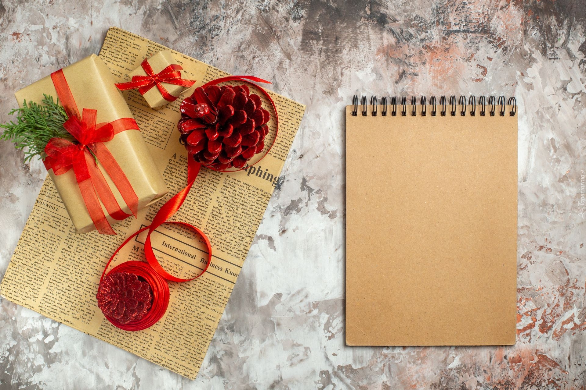 Edytor tapety: Notatnik obok prezentów i czerwonych szyszek