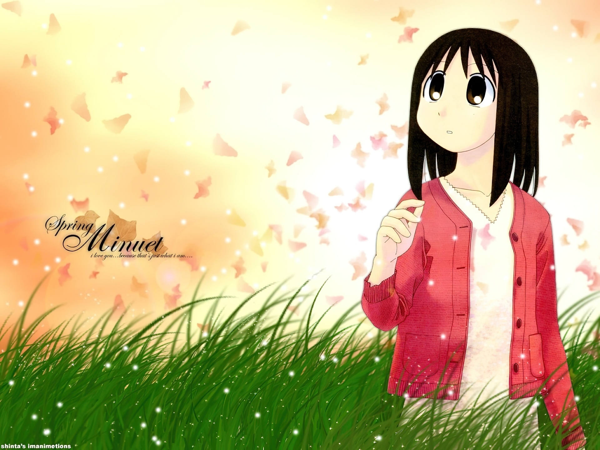 Edytor tapety: Azumanga Daioh, dziewczyna, trawa, napisy, motyle