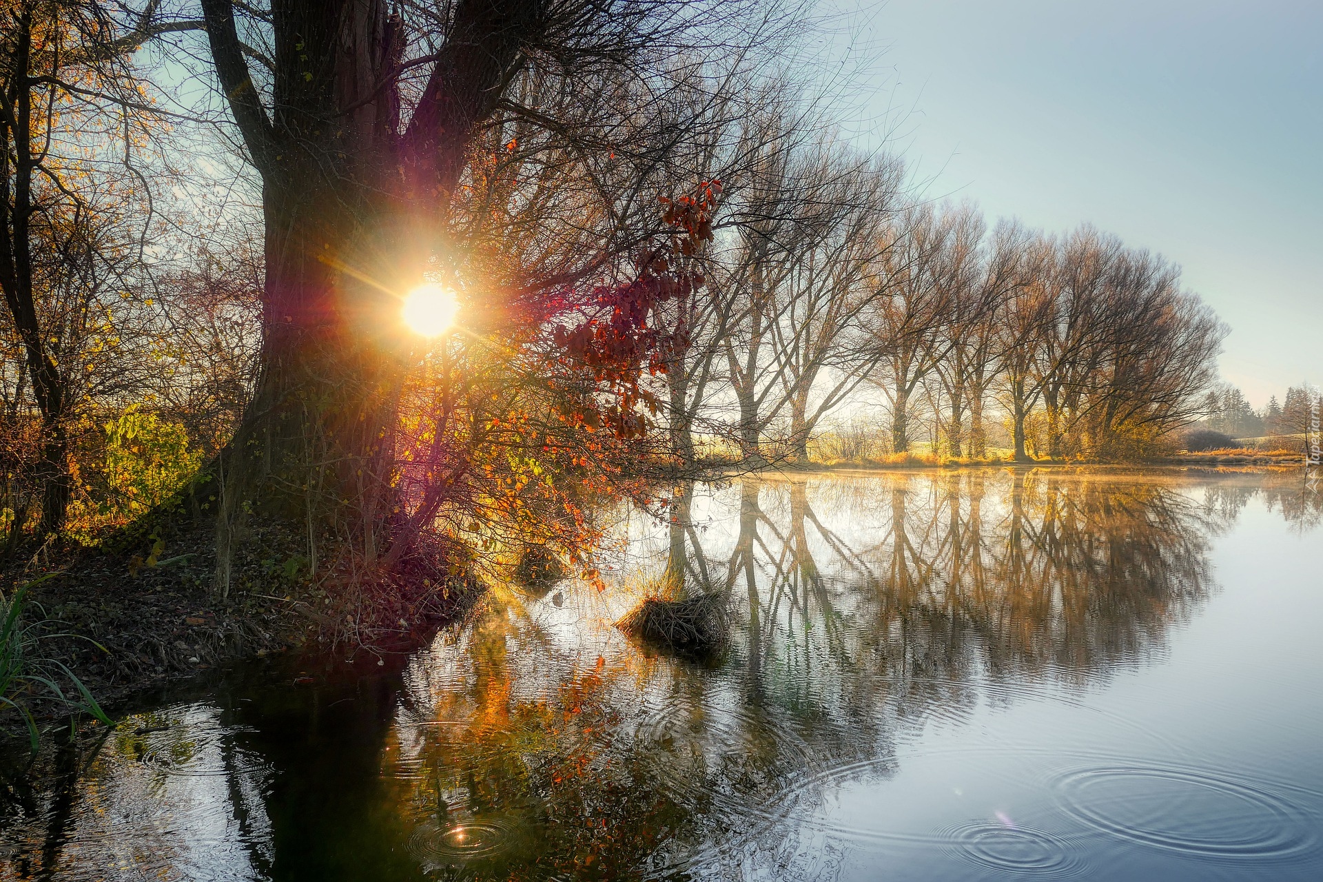 Edytor tapety: Promienie słońca pomiędzy jesiennymi drzewami nad stawem