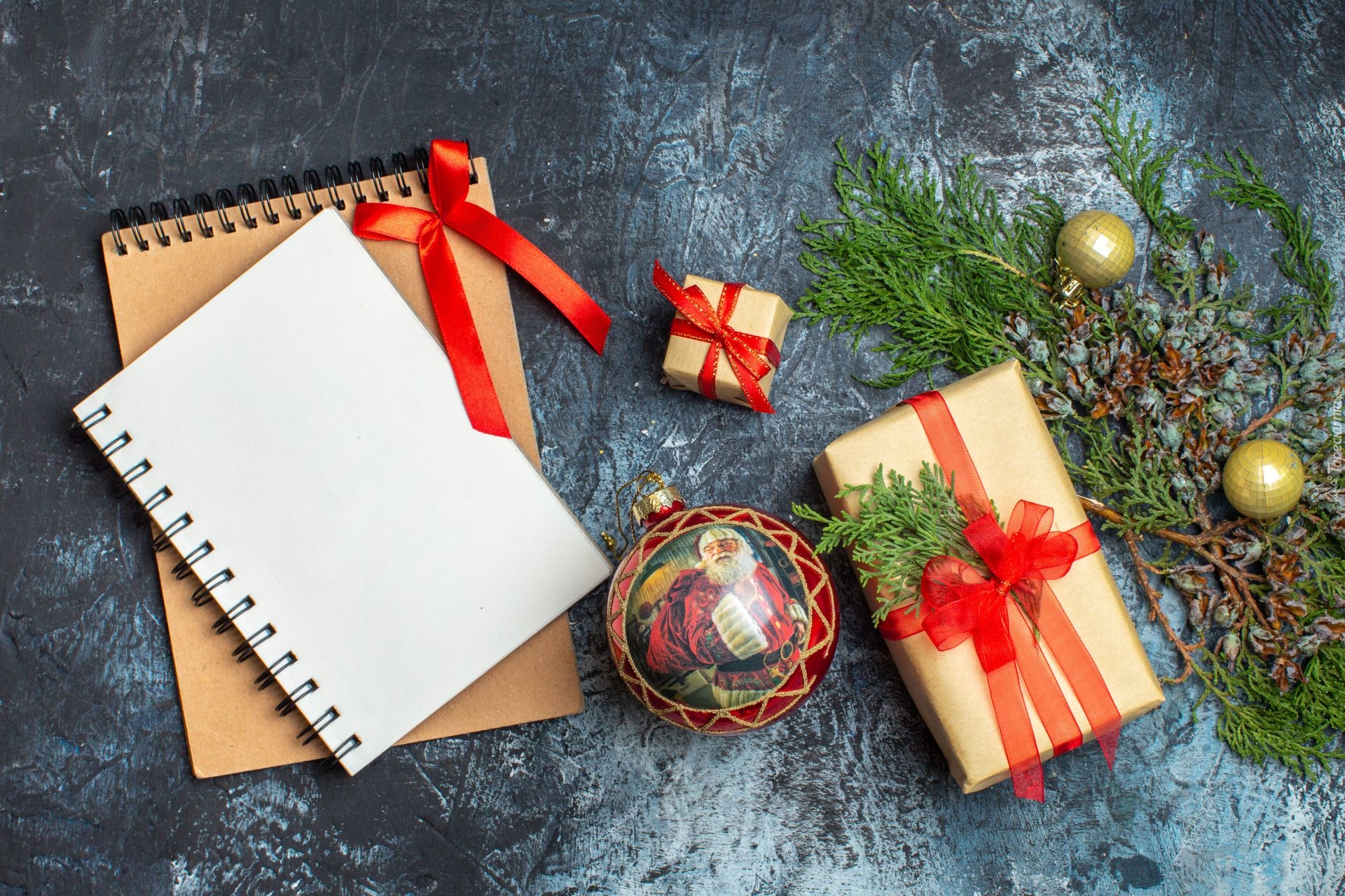 Edytor tapety: Notatniki i prezenty obok bombki