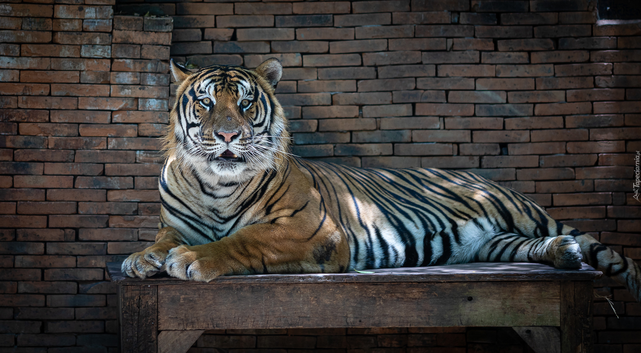 Edytor tapety: Tygrys leżący na ławce pod ceglastym murem