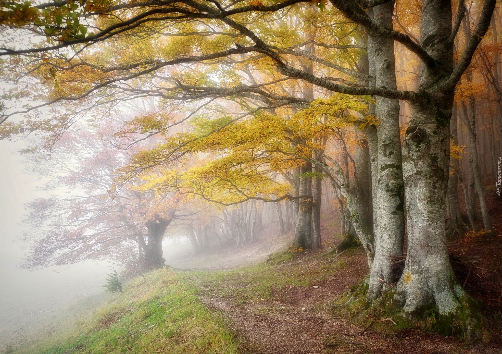 Edytor tapety: Jesienne drzewa obok zamglonej drogi