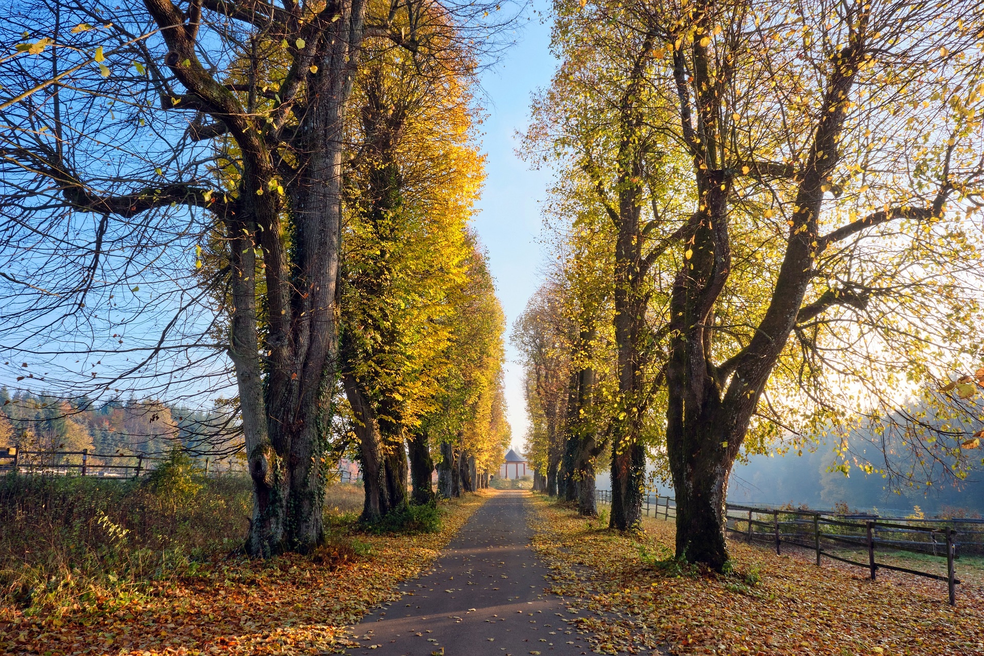 Edytor tapety: Opadłe liście pod drzewami przy ogrodzonej drodze