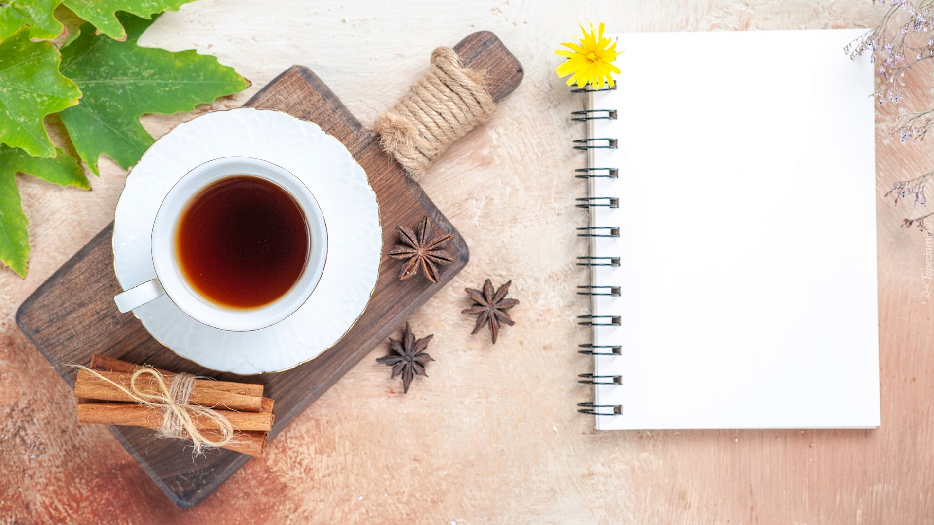 Edytor tapety: Filiżanka herbaty na desce obok notatnika