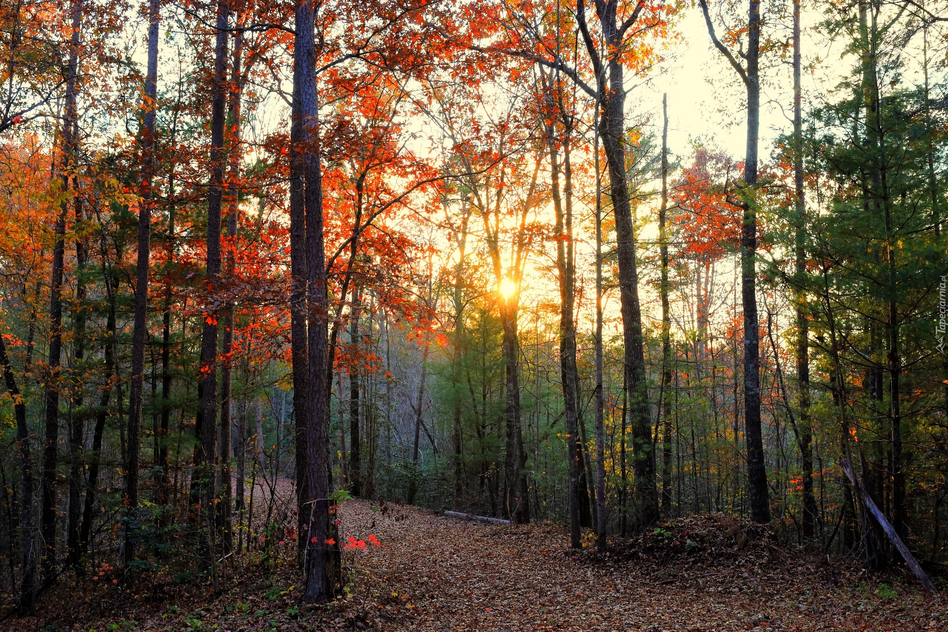 Edytor tapety: Słońce prześwitujące przez jesienne drzewa w lesie