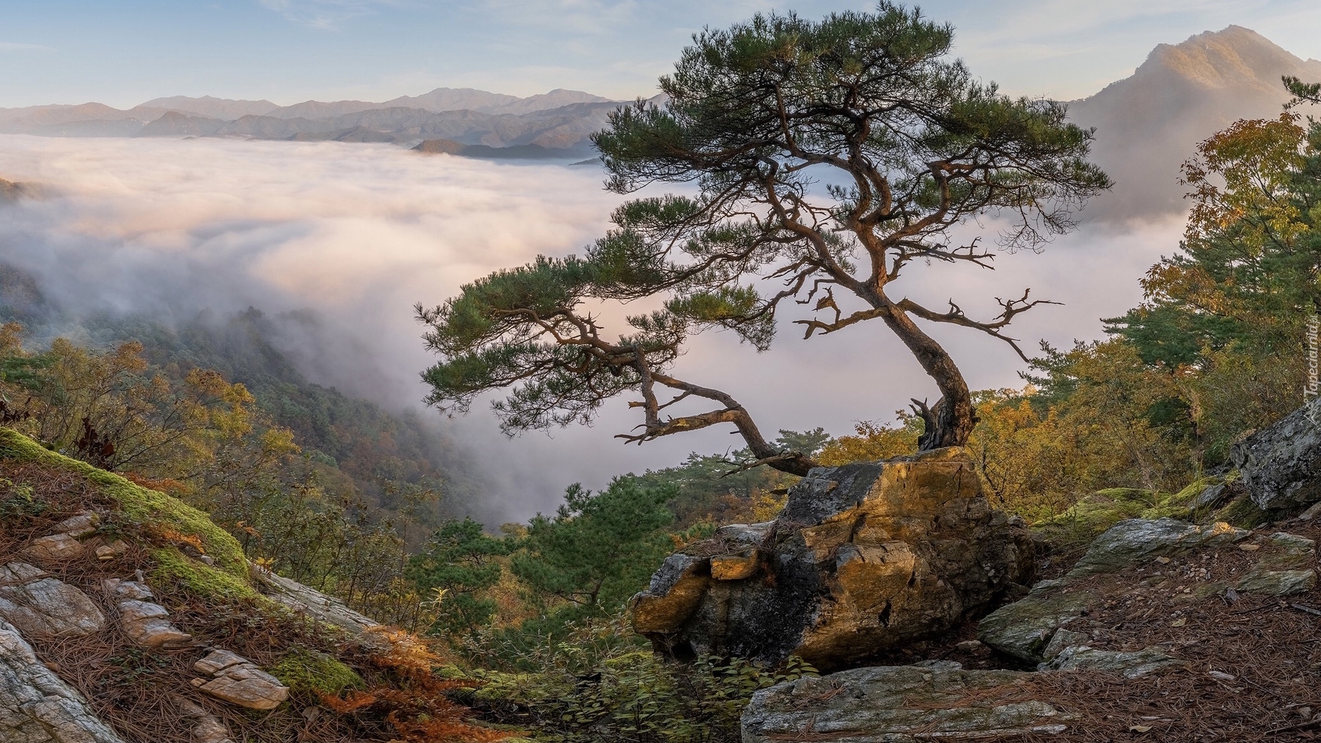 Edytor tapety: Sosna na skale i góry we mgle